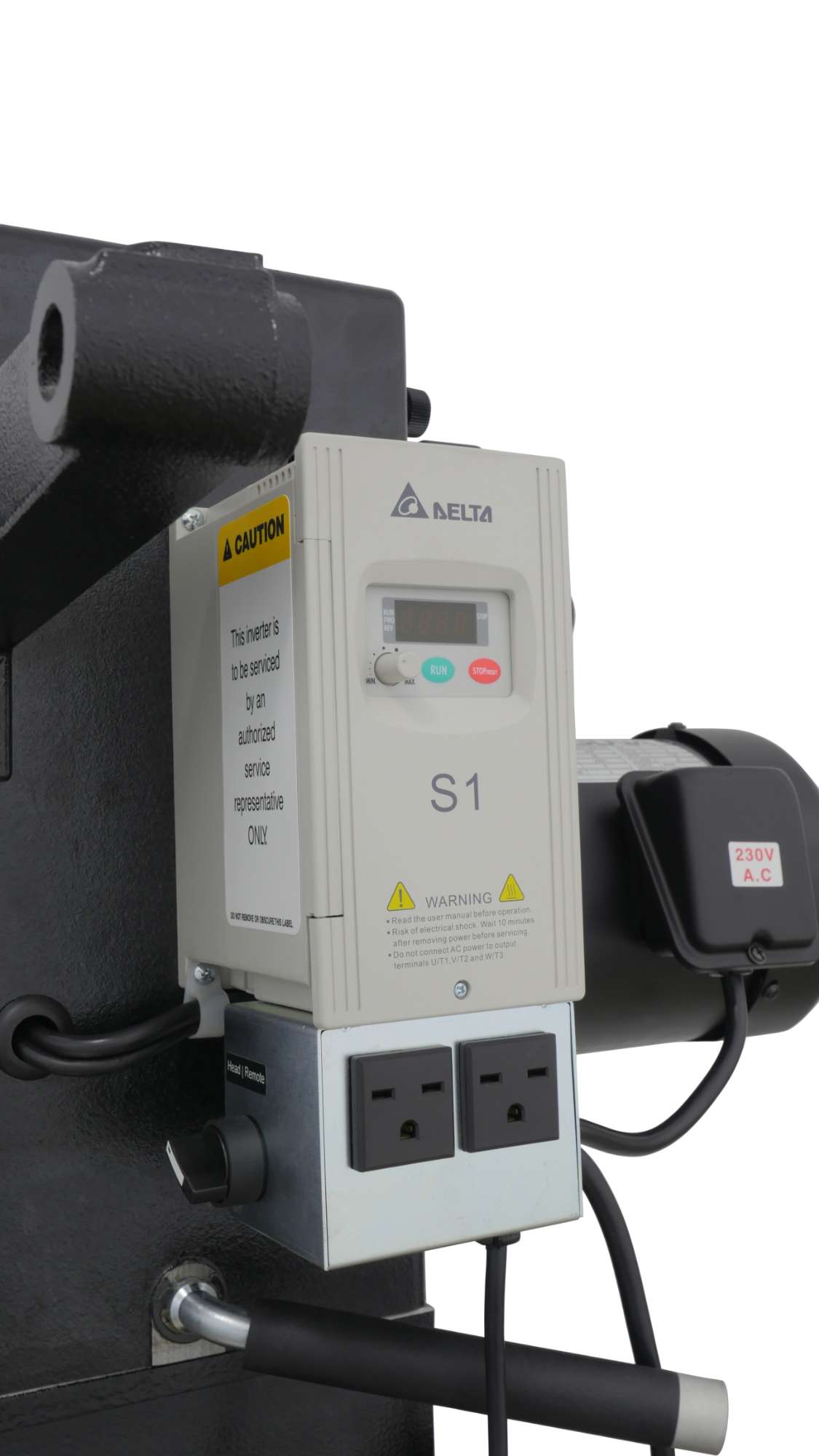 The first feature that will catch your attention is undoubtedly the ergonomic angled control panel made from anodized aluminum. The blue hue of the DRO along with the beautiful knurled control knob fitted with a rubber grip signals this is no ordinary lathe.The bed is made from steel which allows the cast iron headstock to travel incredibly smoothly. Steel is the preferred material due to its well known longevity & strength.Electronic variable speed is obtained via a VFD that converts 1 phase input to 3 phase output, so even at low settings you will get an incredible amount of torque. The DRO gives you an accurate RPM readout at all times any fine adjustments are made electronically. Changing from high to low settings is made easy by using the quick release handle.The headstock & tailstock lock handles are situated on the back to eliminate any interruptions to your work flow. Ergonomically designed handles use a cam lock resulting in a firm feel with no deflection.